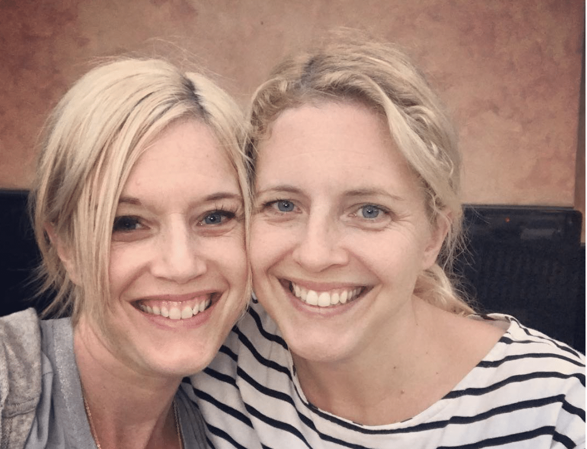 Two women with blonde hair smiling, sitting closely together for a selfie in front of a brown background.