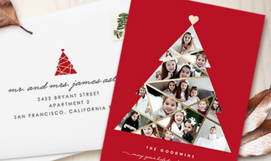 A Christmas card with a white tree photo collage on a red background is shown next to an addressed envelope with a holiday stamp and dried leaves.